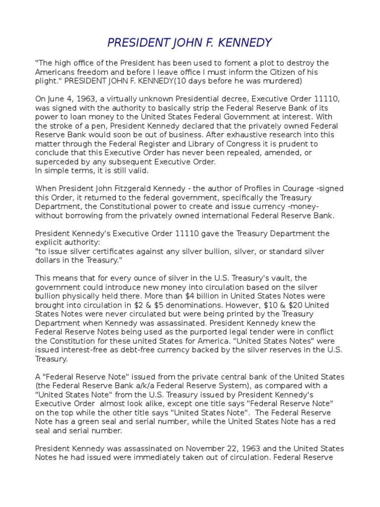 It would have almost immediately given the u s. This executive order 11110 is rescinded by president lyndon baines johnson the 36th president of the united states 1963 to 1969 on air force one from dallas to washington the same day as president kennedy was assassinated. This interesting read about executive order 11110 a presidential decree inacted june 4th 1963 that strips the federal reserve of it s authority to charge interest on money loaned to the us government money that is created out of thin air.